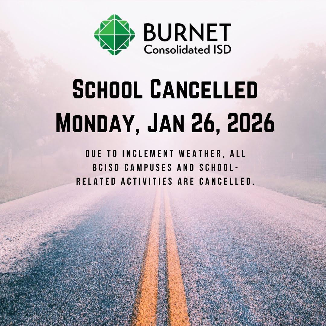 Due to inclement weather and concerns for student and staff safety, all campuses and buildings in Burnet CISD will be closed on Monday, January 26, 2026. All classes, activities, and events scheduled for Monday are cancelled.
